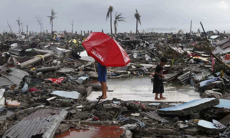 Residents stand on the ruins of their house amidst other destroyed houses after Super Typhoon Haiyan battered Tacloban city in central Philippines November 10, 2013. REUTERS/Erik De Castro